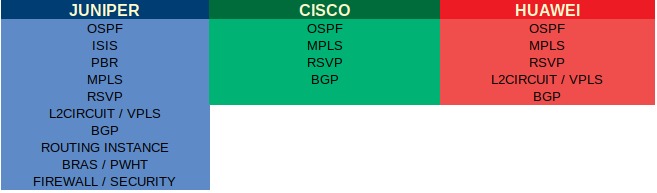 Realizamos serviço de configurações de equipamentos JUNIPER, CISCO, HUAWEI, MIKROTIK e A10 NETWORKS entre outros.